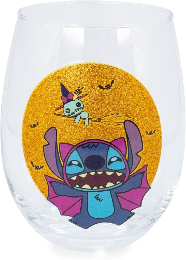 • Scary Good Design: Say cheers with this stemless wine glass. Features Stitch and Scrump dressed up for a fun night of Halloween. A glittery full moon adds a touch of midnight sparkle.