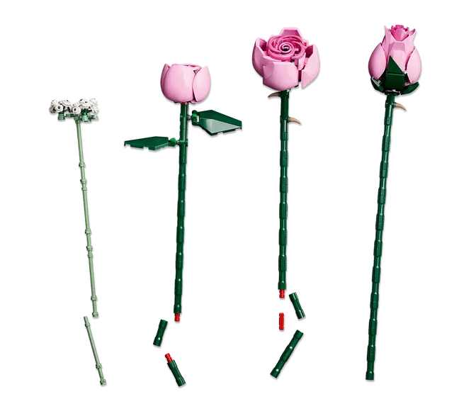 • LEGO® flowers – The set features 4 roses in full bloom, 4 roses blossoming and 4 rosebuds, as well as 4 sprigs of baby’s breath with white flowers