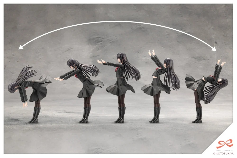 • By using pull-out shoulder joints, twisting movement of the chest and abdomen (both back and forth, and left and right), a movable skirt, and double joints in the elbows and knees, Kuon can get into intense action poses such as holding a sword with both hands, unsheathing the sword, and kneeling.