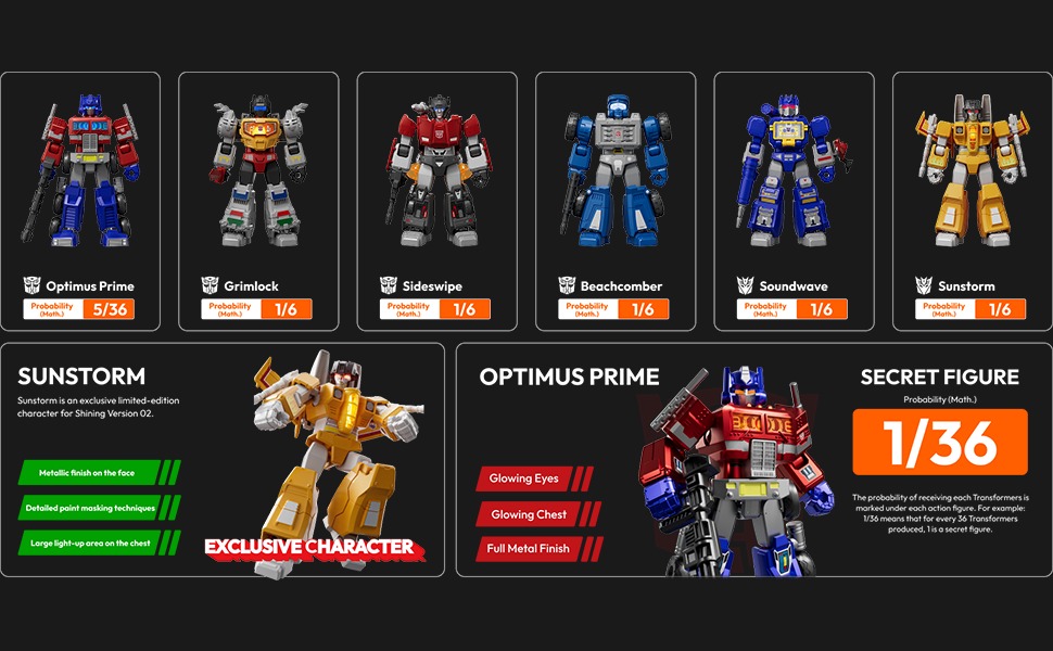 Officially licensed Blokees Transformers are back with a luminous twist! Shining Version 02 features classic 1985 characters with glowing eyes and chests. Each surprise box contains a mystery model kit, including the rare metallic Optimus Prime. With 20+ points of articulation, these model kits are highly poseable. The Autobots and Decepticons shine brighter than ever in the Shining Version 02 collection! This series brings your favorite 1985 Transformers to life with glowing eyes and chests, premium articulation, and incredible detail.