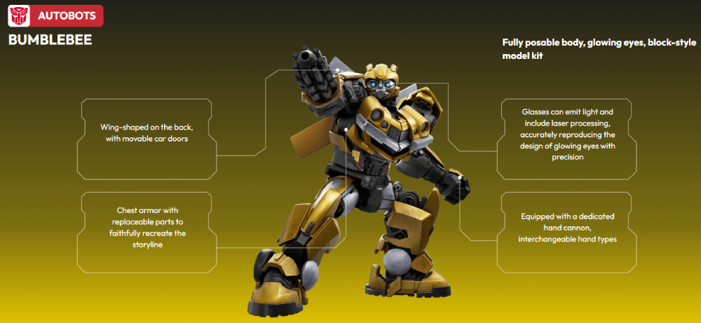 Choose your favorite heroes like Optimus Prime, Bumblebee, and more. No messy tools are required with our assembly character toys – assemble with ease by snapping the bricks together. Crafted from high-quality ABS plastic, these model kits are durable and detailed. They're not just collectibles; they inspire creativity, storytelling, and imaginative play. Reach past the big screen and assemble the ultimate Transformers collection to relive epic battles. Proudly display those Autobots on your desk as a tribute to your Cybertronian heroes.