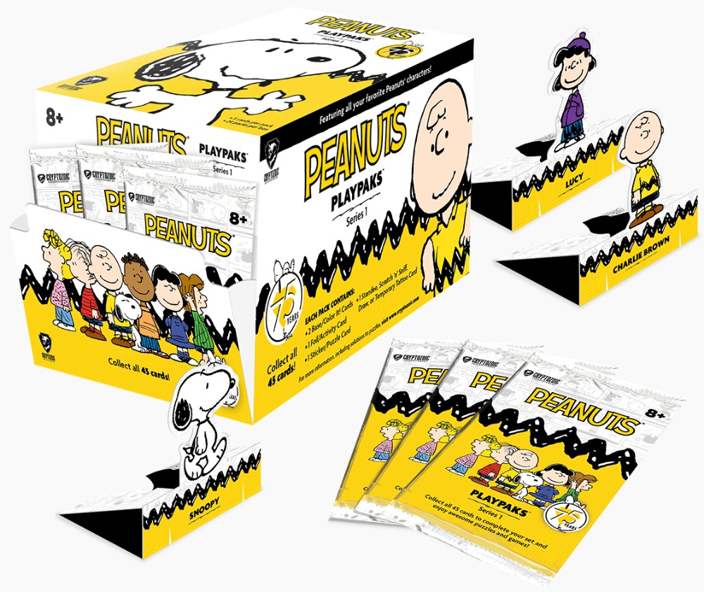 Peanuts Playpaks: 75 Years feature fun on both sides of most cards! Fans can collect the Base/Color It Set and give Chase Sets: Foil/Activity, Sticker/Puzzle, Standee, Scratch 'n' Sniff/How to Draw, and Temporary Tattoo. There is something exciting for Peanuts fans of all ages!