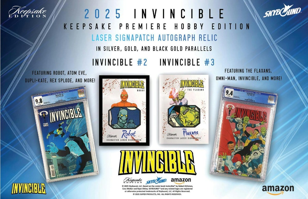 The ultimate chase card will be the 1st Edition Invincible Laser Signapatch Autograph Relic card featuring Original pieces of a CGC 9.2 Invincible #1 Comic! This card is limited numbered to /99, /10, and 1/1 with the pack odds being 1 in every 3,377 packs or 1 in every 211 boxes / 20 cases!