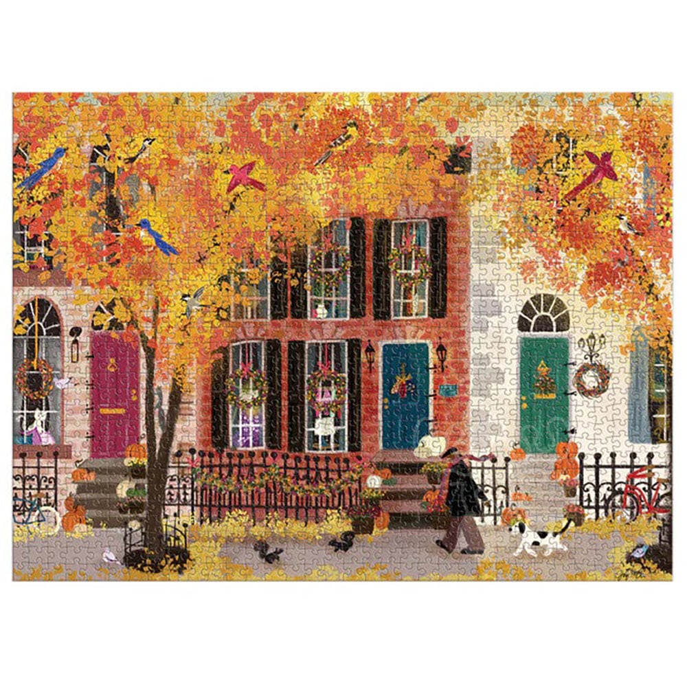 Autumn in the Neighborhood 1000 Piece Puzzle from Galison captures a cozy fall neighborhood scene, providing hours of puzzling fun. Galison puzzles are packaged in matte-finish sturdy boxes, perfect for gifting, reuse, and storage.