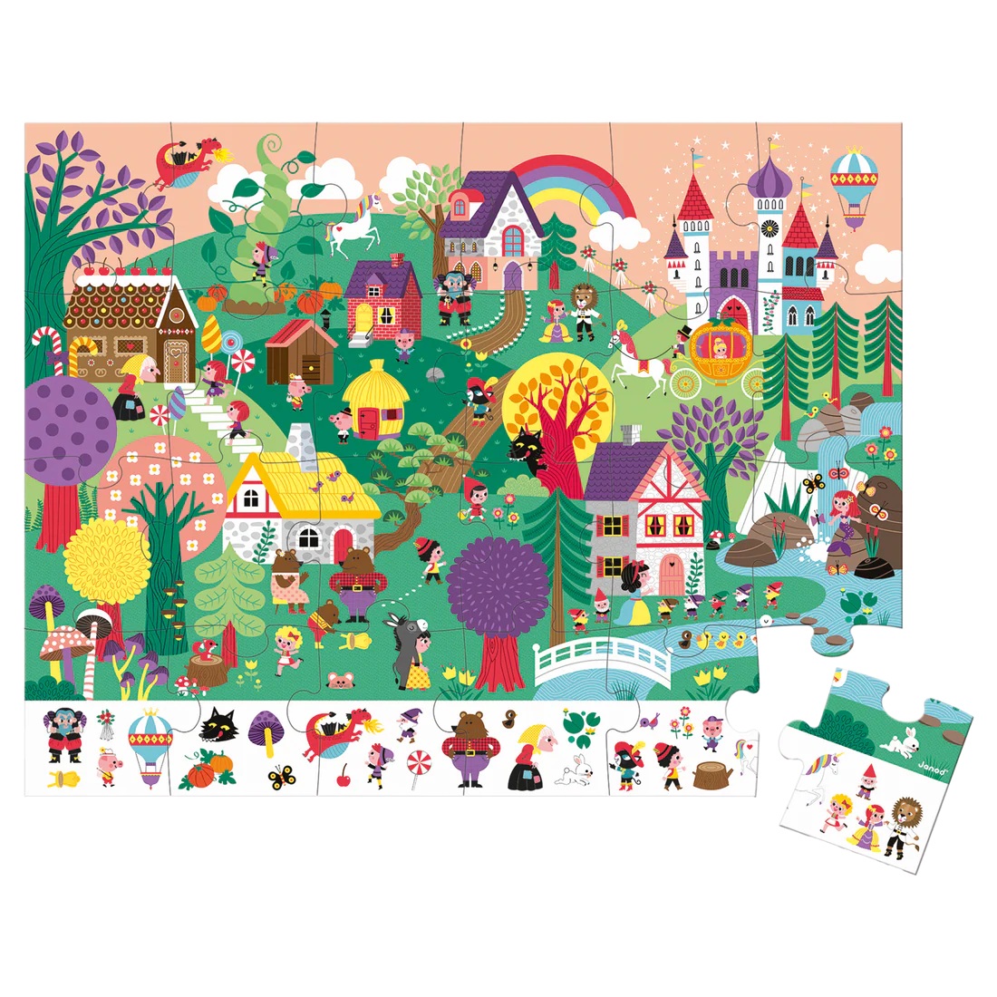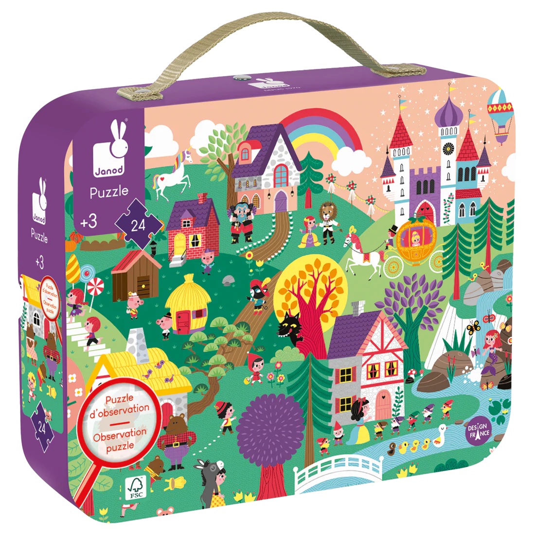 Toy for children over 3 years old. 2 games in 1: A 24-piece puzzle on the theme of stories in a pretty box to carry everywhere. The size of the pieces is adapted to small hands to make the puzzle easier to complete. Once the puzzle is finished, the child can have fun finding the 29 illustrations hidden in the puzzle, indicated at the bottom of it. Closed box with handle and rivet