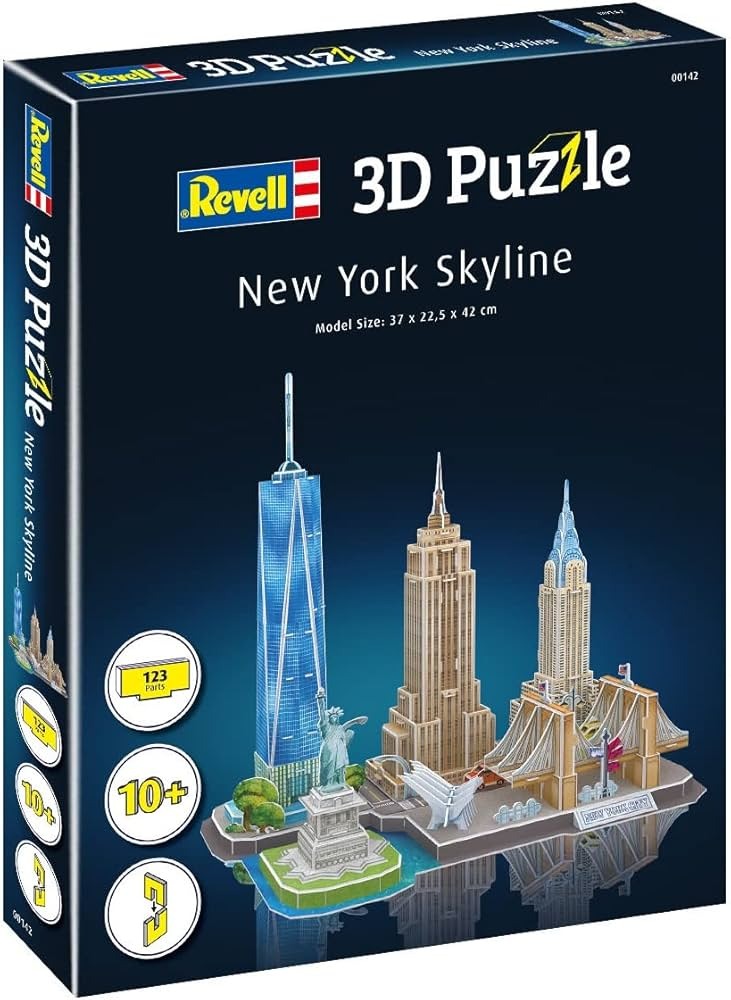 New York is known as the city that never sleeps. The skyline of the city is dominated by huge skyscrapers like Empire State Building and Chrysler Building but also the Statue of Liberty standing on Liberty Island. Currently, the city's tallest building is the One World Trade Center, built in 2014. Crafting fun for young and old! With the Revell 3D puzzles world-famous buildings, impressive skylines or legendary vehicles can be assembled as three-dimensional models for everyone. The precisely punched foam components make the assembly easy - no need for colle or tools. Depending on the size and complexity of the model, the fun of building can range from a few minutes to several hours. Age:10+ Number of parts:123 Length:370 mm, Width:225 mm, Height:420 mm