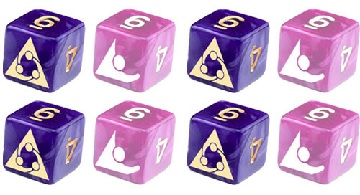 BESM Dice for your gameplay — eight six-sided dice, with four dice of each of two colors. The dice will have two different custom designs on them: the full Tri-Stat System logo that powers BESM Fourth Edition (replacing the 3s; reflecting a group of>Si vous voulez 0