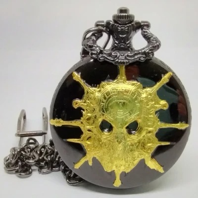 Metal pocket dice case with polyhedral mini-kit: mystic helm - black & gold in a black suedecloth pouch