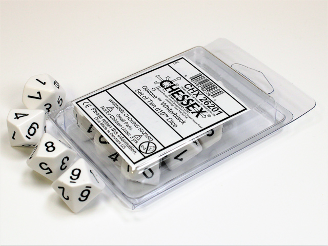 CHESSEX - 10D10 DICE SET, OPAQUE WHITE WITH BLACK NUMBERS - 10D10 DICE SET OPAQUE is categorised ROLE-PLAYING GAMES / ACCESSORIES / DICES and sold by l'Imaginaire, a store and specialised website.