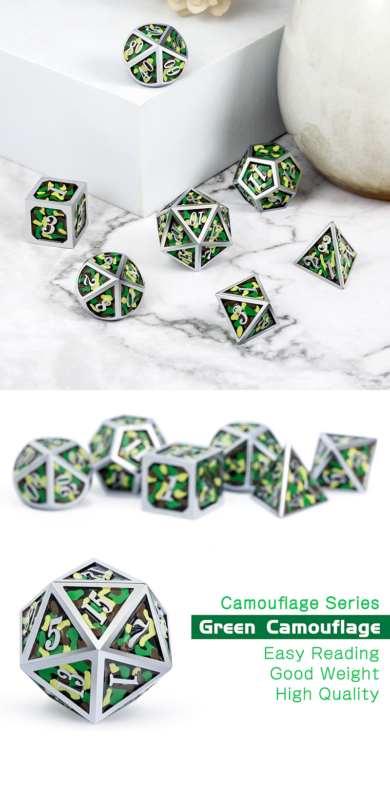 DICE HABIT - 7 DICE RPG SET - 7 DICE RPG SET, METAL & ENAMEL, GREEN CAMOUFLAGE