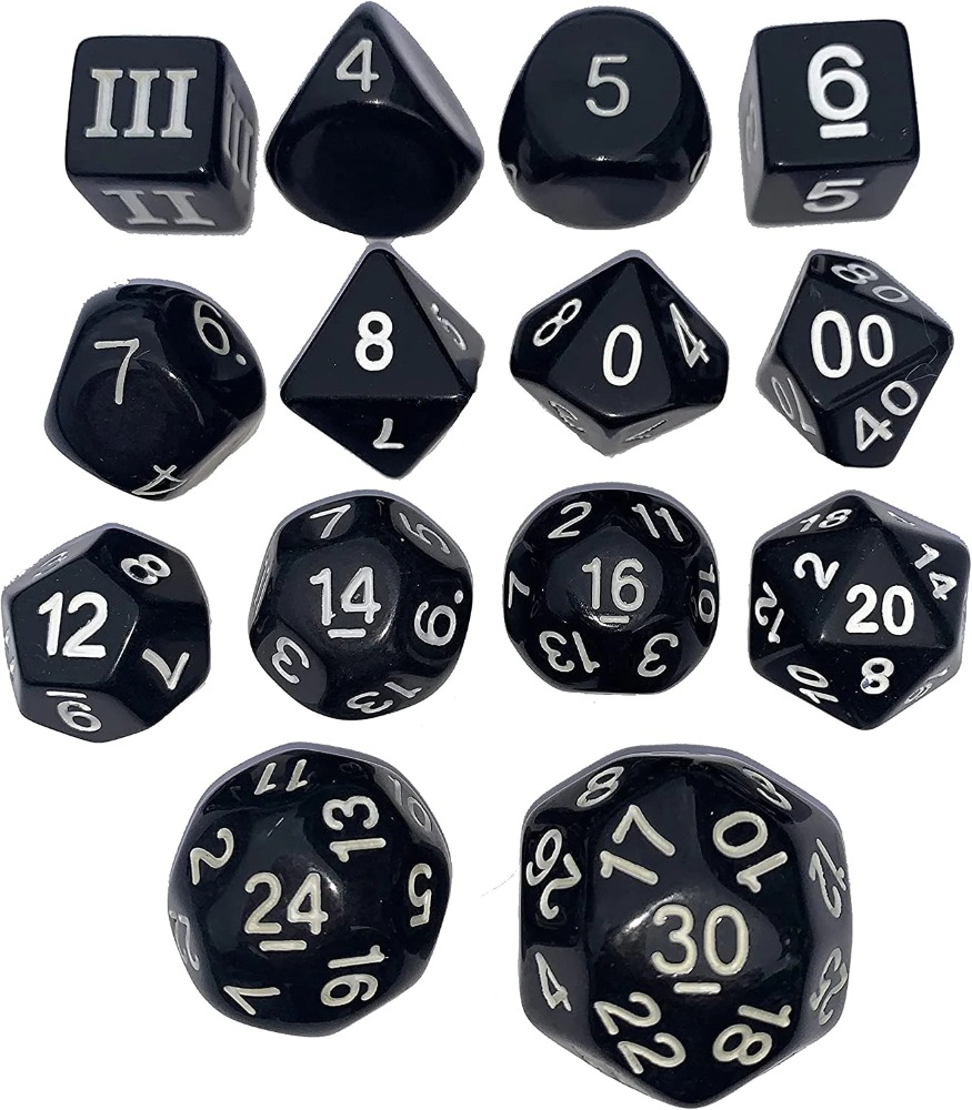 Contains Roman D3, Top Read D4, D5, D6, D7, D8, D10, D%10, D12, D14, D16, D20, D24 and D30.