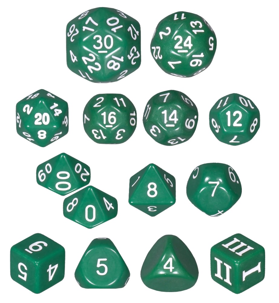 Contains Roman D3, Top Read D4, D5, D6, D7, D8, D10, D%10, D12, D14, D16, D20, D24 and D30.