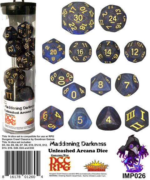 DUNGEON CRAWL CLASSICS - 14 DICE DCC RPG SET, OPAQUE MADDENING DARKNESS DCC RPG is categorised ROLE-PLAYING GAMES / ACCESSORIES / DICES and sold by l'Imaginaire, a store and specialised website.