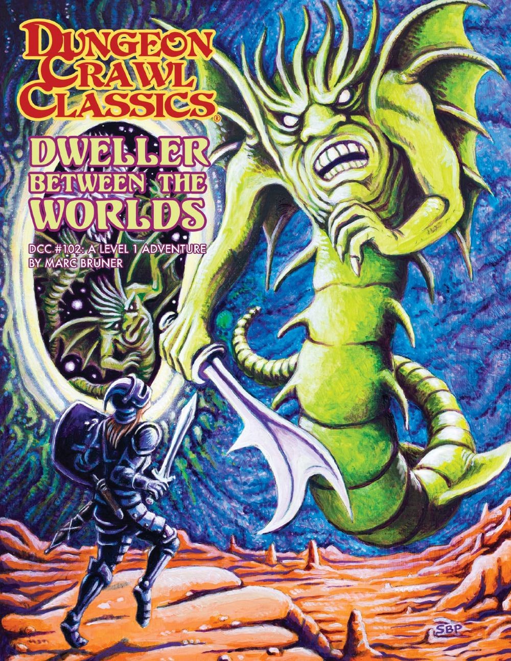 Doom blankets the land as rumors spread of a dire evil rising in the east. For the first time in living memory, the winter snows have arrived before the harvest, bringing with them an unnatural bitter chill, and in taverns and inns travelers whisper of strange creatures emerging from the ancient forest said to leave entire villages standing silent and empty of inhabitants.  Now a call has gone out across the valley to gather the clans to discuss the dark tidings and decide how to oppose this growing threat. As the banners of a dozen chiefs and thanes are raised, the PCs must ready for an uncertain war against an unknowable foe from the spaces between dimensions! Dweller Between the Worlds is a Dungeon Crawl Classics RPG adventure intended for a group of five to six level-1 characters.  Written by Marc Bruner, with cover art by Stefan Poag.