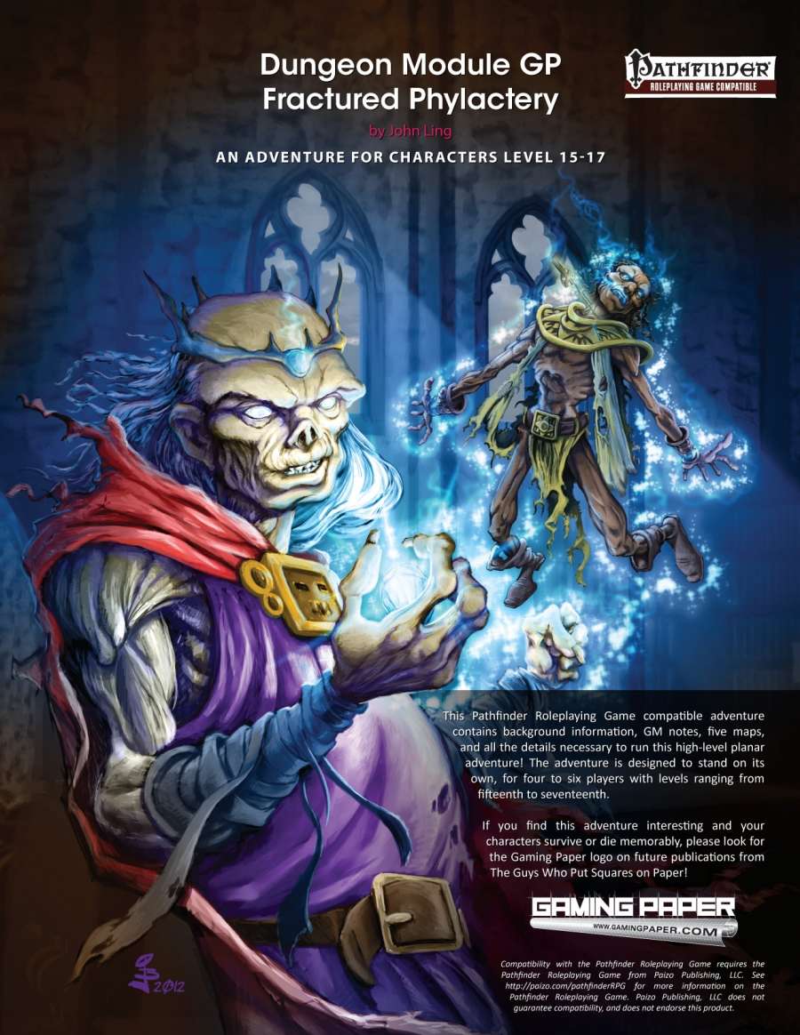 The Fractured Phylactery is an adventure for 15th–17th level characters. Written by John Ling, maps by Robert Lazzaretti, and with stunning artwork by Joel Biske this adventure is compatible with the Pathfinder Roleplaying Game.