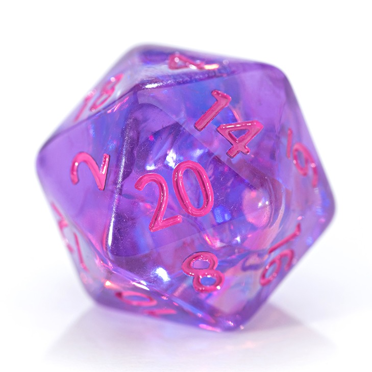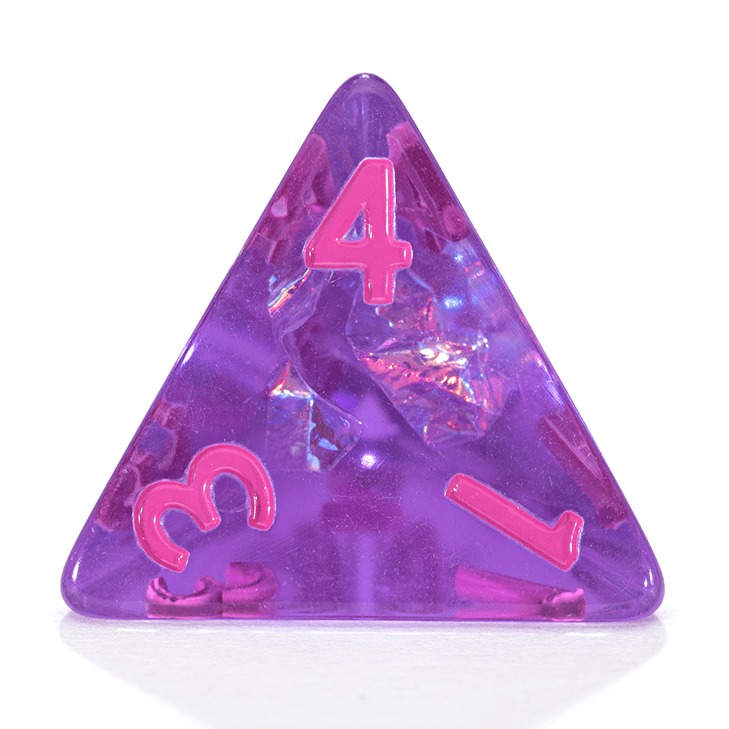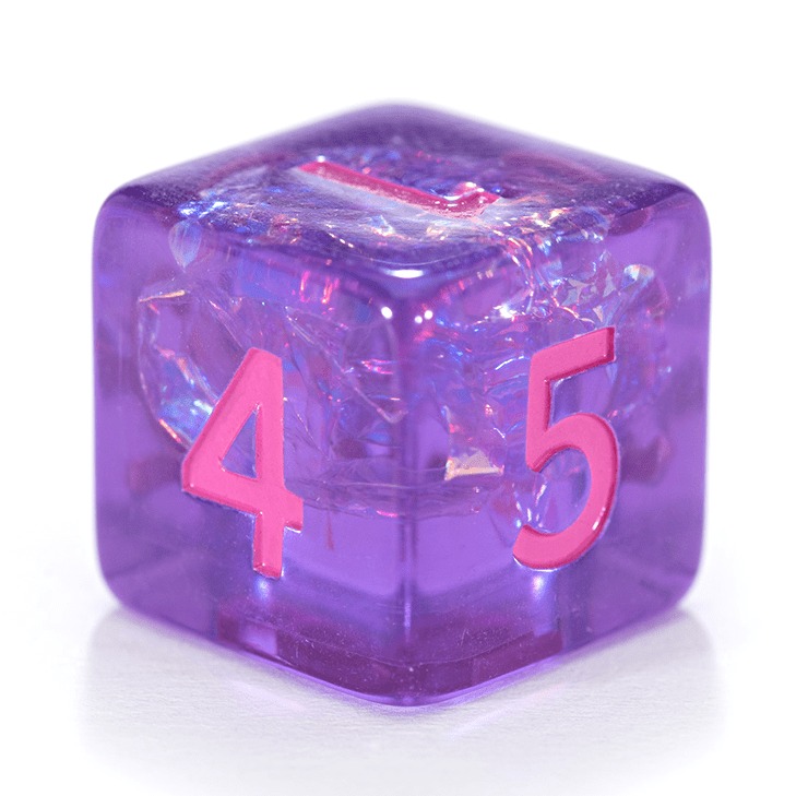 Inclusion Dice are a wide variety of customized dice designs that contain unique items of any possible material or design inside each die! As every set's design is entirely unique, these ingenious sets are identified by their inclusions! This creative Inclusion Dice set has shards of holographic purple Rock Candy forming inside of a beautiful Violet resin with Candy Pink numerals!