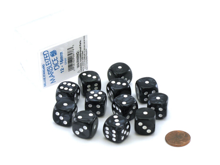 These 12 deluxe marble dice are numbered from one to six with traditional dice pips etched into the sides and painted white. At 16mm tall the dice are considered standard sized. The dice feature smooth round edges, and a high quality marbleized look and feel. Great for any dice game. Includes 12 dice in a clear plastic display case.
