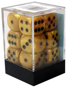 These 12 deluxe marble dice are numbered from one to six with traditional dice pips etched into the sides and painted white. At 16mm tall the dice are considered standard sized. The dice feature smooth round edges, and a high quality marbleized look and feel. Great for any dice game. Includes 12 dice in a clear plastic display case.
