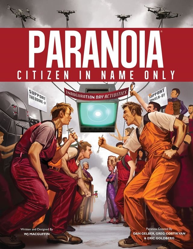 Citizen In Name Only (CINO) is a complete mission for the Paranoia roleplaying game. Players will have two Troubleshooter teams: One that is anti-CINOs and one that is... well, not pro-CINOs per se, but at least against the FCCCP pope’s takeover. That’s right, players will literally fight themselves as the narrative flips between rival teams, including a climactic battle where players must plan the attack and the defence.