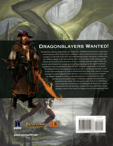 Founded by a famous dragonslayer, the small town of Belhaim has become a sleepy rural community justoff the beaten path, a settlement where everyone know everyone and strangers are the talk of the town. But when Belhaim's peace and quiet is shattered by the sudden collapse of the last standing tower ofits founder's castle, things quickly bloom out of control. Why werethere bodies of kobolds amid the rubble ? What's the sinister secret behind the strange sounds of flapping wings in the night ? And what's happened to local wizard Balthus Hunclay, who's not answering knock on his door ? The collapsed tower had long been an eyesore to the cantankerous old man - could he have had something to do with its destruction ? And what of the rumors of strange stirrings in nearby Dragonfen ? Has Belhaim's ancient draconic nemesis returned ? TheDragon's Demand is a deluxe super-adventure for 1st-level characters, and includes 64 action-packed pages of adventure and new monsters, plus a beautiful double-sided, full-color poster map of the town of Belhaim and an important miniatures-scale battleground ! Players can expect to reach 7th level by the time they complete this epicadventure - if they manage to survive the wrath of a dragon when his demands aren't met !