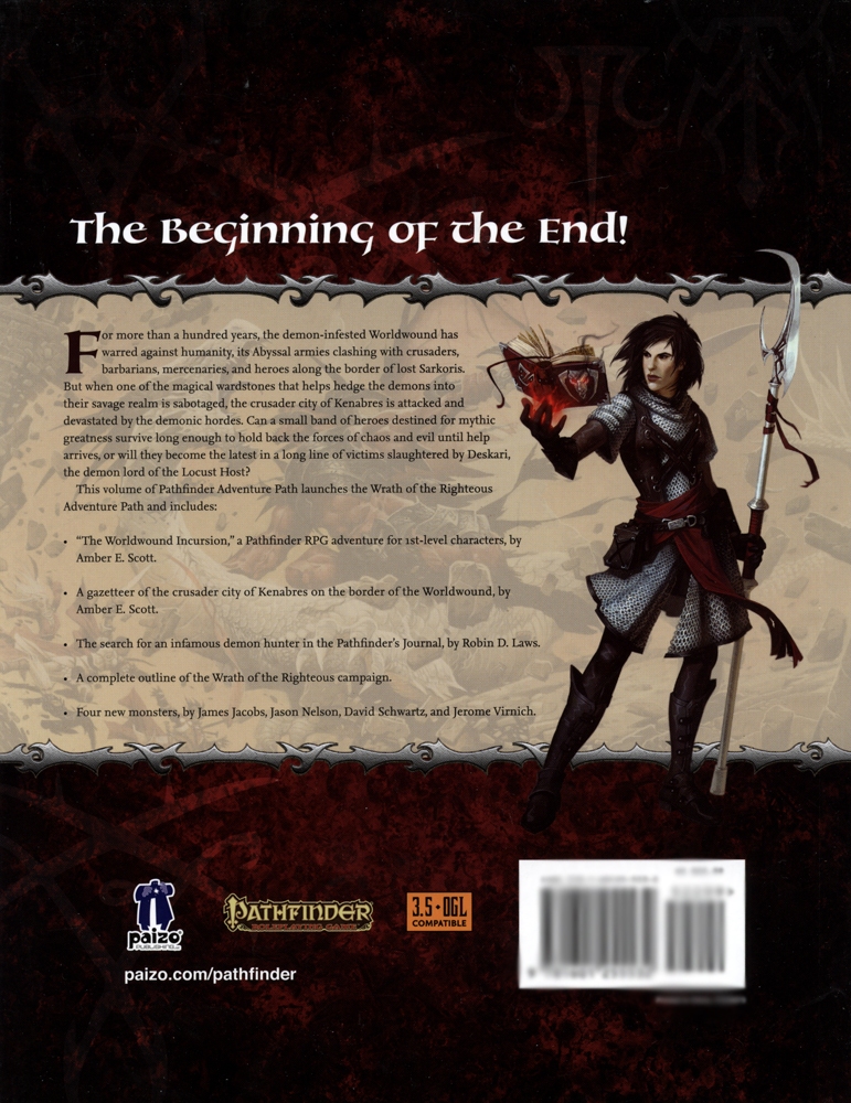 For more than a hundred years, the demon-infested Worldwound has warred against humanity, its Abyssal armies clashing with crusaders, barbarians, mercenaries, and heroes along the border of lost Sarkoris. But when one of the magical wardstones that helps hedge the demons into their savage realm is sabotaged, the crusader city of Kenabres is attacked and devastated bythe demonic hordes. Can a small band of heroes destined for mythic greatness survive long enough to hold back the forces of chaos and evil until help arrives, or will they become the latest in a long line of victims slaughtered by Deskari, the demon lord of the Locust Host ?
