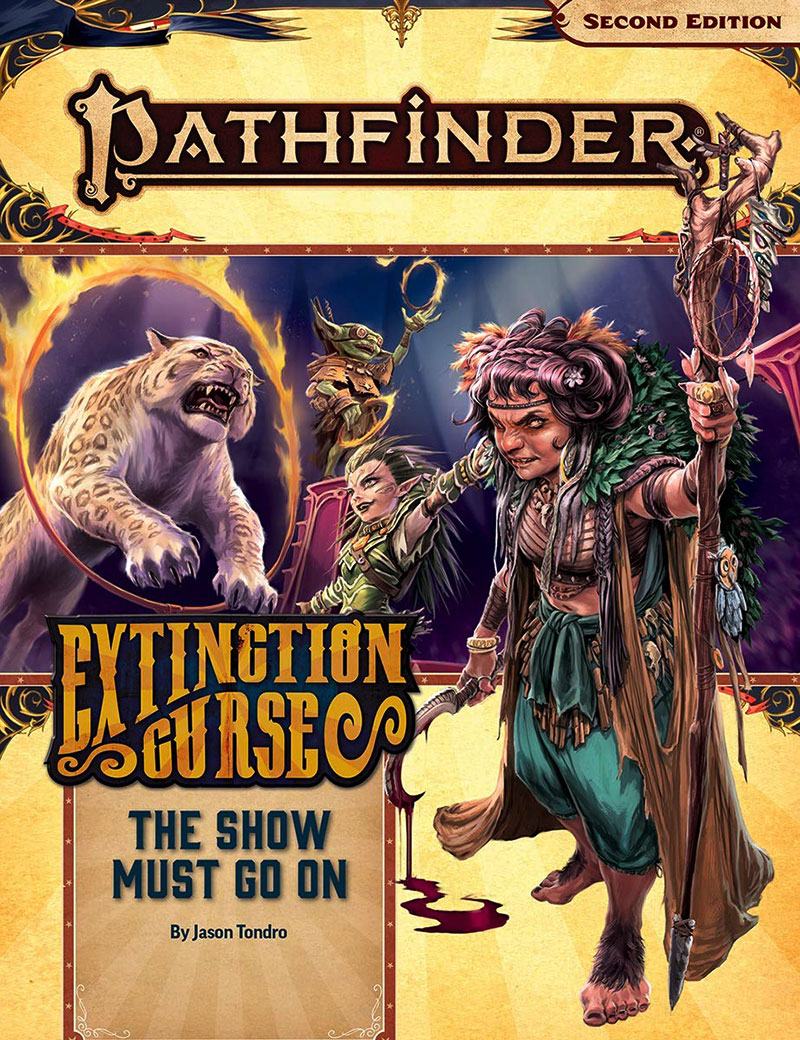 "The Show Must Go On" is a Pathfinder Second Edition adventure for four 1st-level characters. This adventure begins the Extinction Curse Adventure Path, a six-part, monthly campaign in which the heroes lead a traveling circus as they unravel a plot to eradicate all life from the Starstone Isles at the heart of the Inner Sea. The adventure also includes advice on how to run a traveling circus, new circus-themed rules, and a menagerie of monsters both wondrous and wicked.
