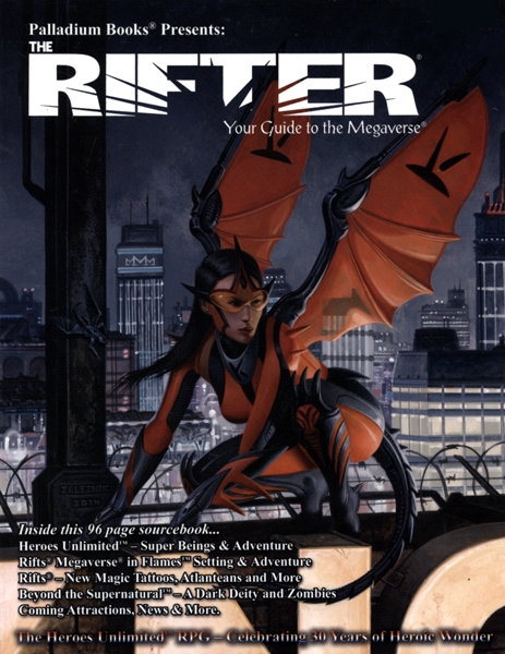 The Rifter® #68 is about monsters, war and dangerous secrets. There is a war about to erupt on Rifts Earth and the fate of all mortal life may hang in the balance. In the dimension of Beyond the Supernatural, a different sort of invading alien intelligence makes its presence known, and on a lighter note, misfit heroes fight for truth, justice and, well, you know. Source material for Heroes Unlimited™, Beyond the Supernatural™ and Rifts® makes this a fun issue; plus news and a lot of coming attractions, special offers and season greetings.