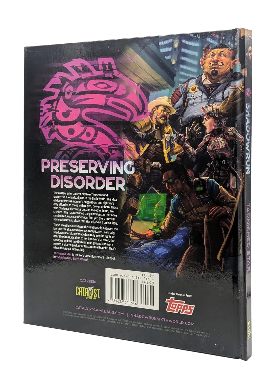 Tarnished Star is the core law enforcement and security rulebook for Shadowrun, Sixth World. Shadowrun has a long history of law enforcement and security-themed books. Books from previous editions such as Lone Star, Corporate Security, and Street Lethal highlighted those enforcing the law but also tricks and tactics used against shadowrunners and crime in general. Tarnished Star takes this a step further and not only looks at and updates these tactics, techniques, and tech currently used by the law in the Sixth World, but also takes a look at those behind the badges. Additionally, it delves into the complex relationship between both shadowrunner and law enforcement/security agents, not only as antagonists but sometimes as allies and contacts.