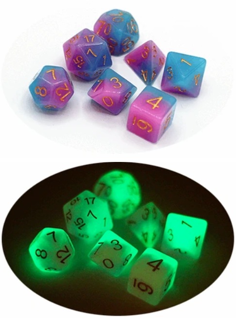 The official Glow-in-the-Dark Time Tails RPG dice set includes 7 RPG dice in neon pinks and blues that glow fiercely when the lights go out!