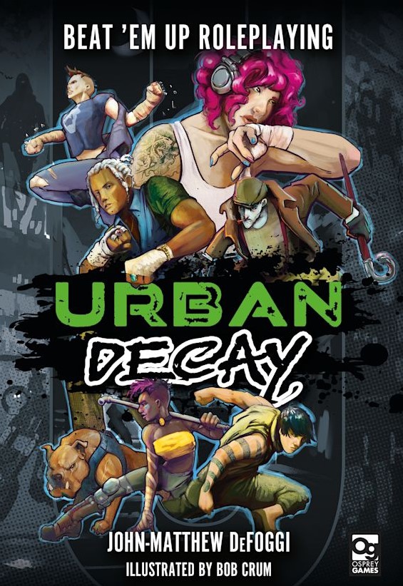 Urban Decay is a roleplaying game of beat 'em up action inspired by classic arcade video games, movies, and comic-books. Players take on the roles of warriors, martial artists, vigilantes, and ordinary citizens, taking to the streets to face the gangs that control the City and to save the people and places they love. Streamlined character and crew creation produces distinct, capable heroes with shared goals and bonds, while the versatile Clash system emphasizes the brutal, gritty street-fights in which these heroes will find themselves. The City itself is built collaboratively, with players working together to define the districts and neighborhoods for which their heroes will go to war.