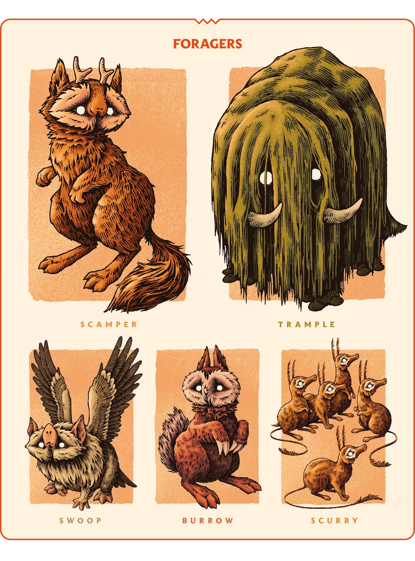 Each creature has a unique skill and hindrance that can make a task easier or introduce a complication, whether it be the gift of flight, superb dexterity, or the ability to work as a team. The rulebook contains all the information to create a base explorer and tweak it to make it unique.