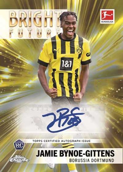 The time has finally come and the Topps Chrome - Bundesliga collection 2022/23 will hit the markets! Another unique line-up with the best players and the most desirable rookies from Germany's top league! New categories will bring you e.g., the BRIGHT FUTURE of the Bundesliga with players like Jamie Bynoe-Gittens or Bayern Munchen's youngest Bundesliga player ever, Paul Wanner. Topps Chrome - Bundesliga also includes all the well-known stars like Jude Bellingham, star signing Sadio Mane or Germany's wonderkid Jamal Musiala.