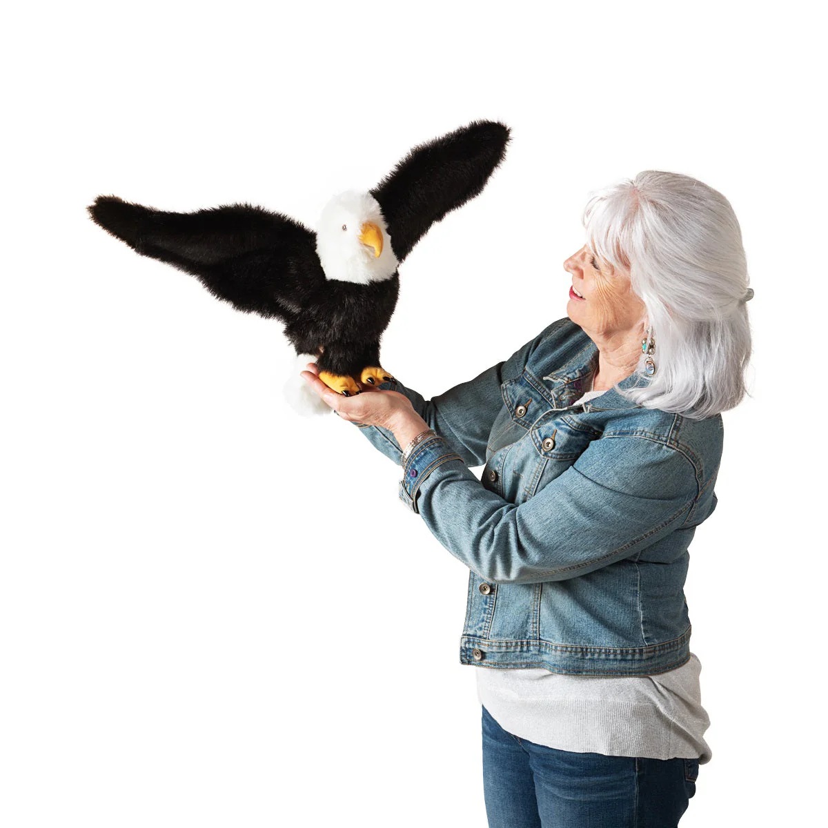 A national symbol and until recently an endangered species, the bald eagle evokes pride and nostalgia. This striking Eagle puppet features feather-like brown and white plush fabric and broad, flappable wings. His beak and talons are gold-colored velveteen.