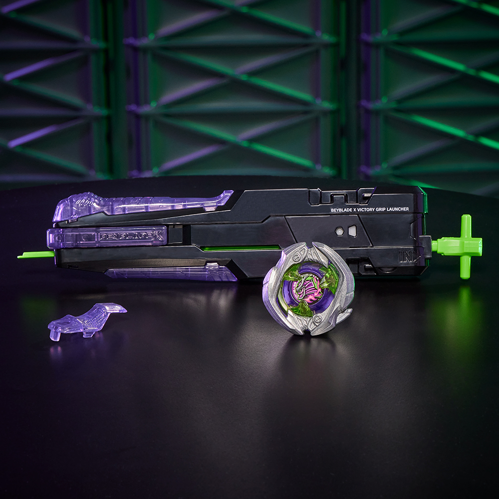 Experience Beyblade X, the next generation of Beyblade stadiums, launchers, and tops! The Victory Grip Launcher Set includes a right-spin launcher with a 10'' (25cm) ripcord and customizable rubber grips. It comes with the Saber Samurai 2-70L Right-Spin Attack Type top, which works with the X-Celerator Gear System to level up your game and prove it in battle!