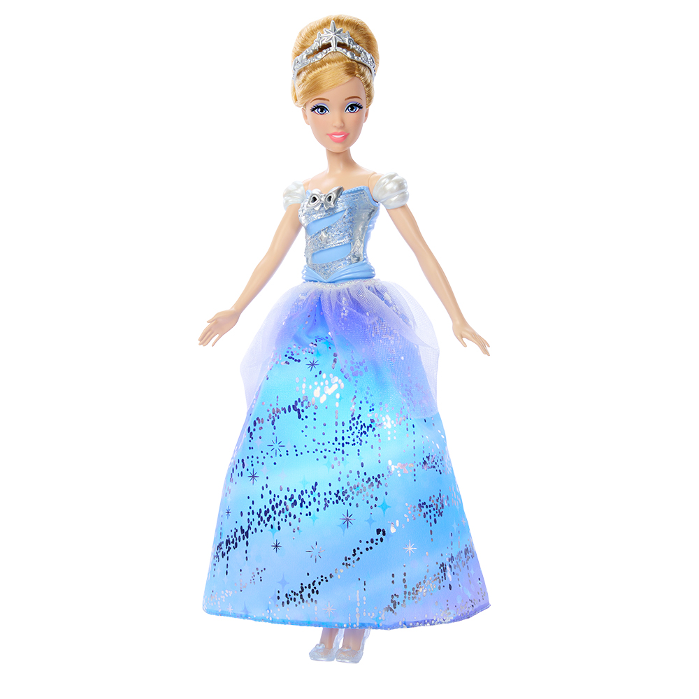 The Cinderella doll with enchanted ball gown recalls the unforgettable moment from the Disney movie when a wave of the wand transforms Cinderella's dress into a swirl of sparkles! Children can recreate the exciting moment at home: wave the included wand (or your hand) over the Cinderella doll to activate a colorful light show with magical sound effects - no magic words needed! The doll cannot stand on its own. Colors and decorations may vary.