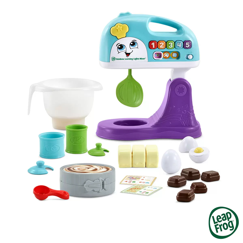 Tout comme l'appareil de comptoir préféré de tous, ce batteur sur socle comprend une tête inclinable, une palette tournante et un bol à mélanger détachable. Créez vos propres recettes ou suivez les instructions des deux cartes de recettes recto-verso. Ajoutez le comptage et les couleurs au mélange. Appuyez sur la toque pour écouter les instructions du mixeur. Utilisez la cuillère rouge pour ajouter de la farine ou deux morceaux de beurre dans le bol à mélanger. Les petits pâtissiers peuvent réaliser plus de 40 recettes fictives de biscuits, de petits gâteaux, de tartes et bien plus encore. Rassemble les morceaux de chocolat, divise le beurre et casse les oeufs pour pouvoir compter et ajouter autant d'ingrédients que nécessaire. Préparons un gâteau aux éclats arc-en-ciel! Ajoute les ingrédients dans le bol à mélanger et appuie sur les touches numériques pour faire tourner la palette avec des lumières colorées. Versez la pâte dans le moule double face, puis retournez-le pour passer de la pâte à gâteau à un gâteau décoré. En faisant tourner ce mixeur, vous pouvez toujours compter sur des friandises colorées.