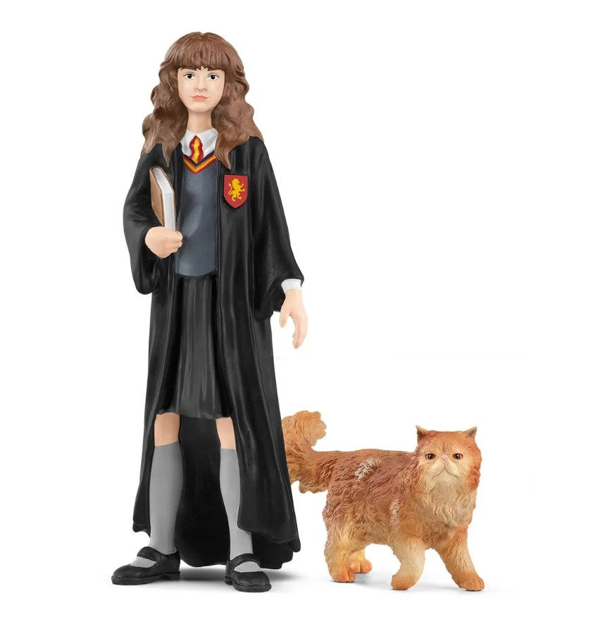 The studious pupil from Gryffindor House, Hermione Granger™, carries a book under her arm while her highly intelligent pet cat, Crookshanks™, remains faithfully by her side.