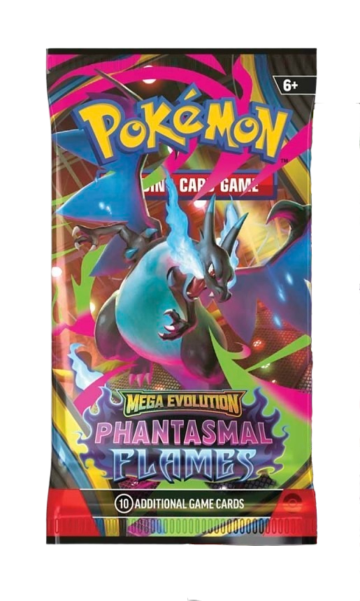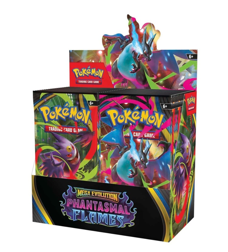 Searing blue flames rip across a dark battlefield as Mega Charizard X ex soars up and looks down upon its opponents! With a deep chill to rival the heat, the shadowy figure of Mega Gengar ex slowly rises into view, and both Pokémon prepare to attack. Determined to prove their mettle, Mega Heracross ex, Mega Lopunny ex, and even more Pokémon line up to give it their all in the Pokémon TCG: Mega Evolution— Phantasmal Flames expansion!