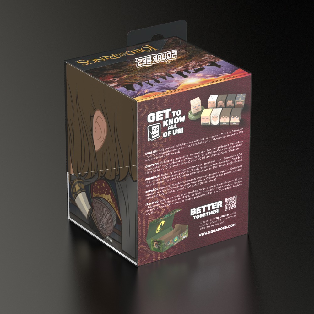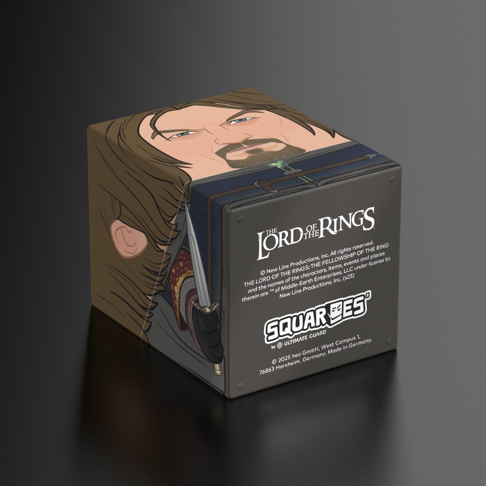 Collectible box for storing TCG decks, tabletop gaming accessories, and/or collectibles. The Boromir Squaroe from the The Lord of the Rings edition holds up to 100 cards in double protective sleeves if used as a deck box. Squaroes are made from 78% renewable resources and fit perfectly into the separately available Collectors Case.