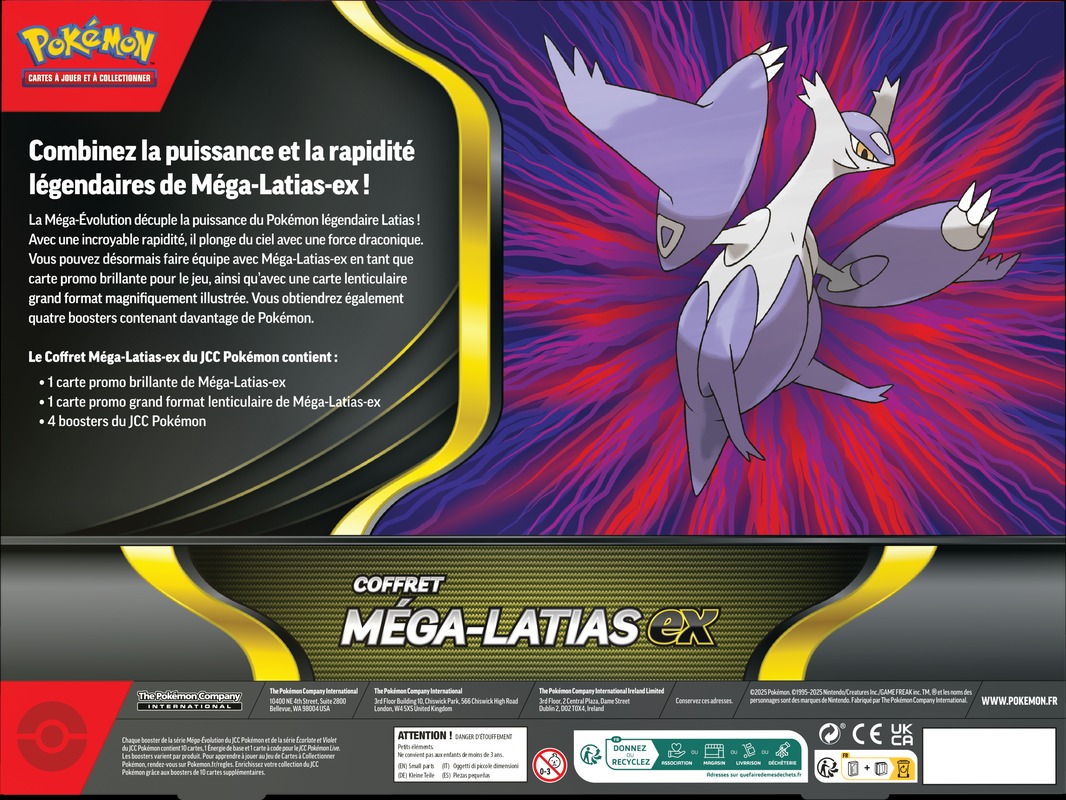 La Méga-Évolution décuple la puissance du Pokémon légendaire Latias ! Avec une incroyable rapidité, il plonge du ciel avec une force draconique. Vous pouvez désormais faire équipe avec Méga-Latias-ex en tant que carte promo brillante pour le jeu, ainsi qu’avec une carte lenticulaire grand format magnifiquement illustrée. Vous obtiendrez également quatre boosters contenant davantage de Pokémon.