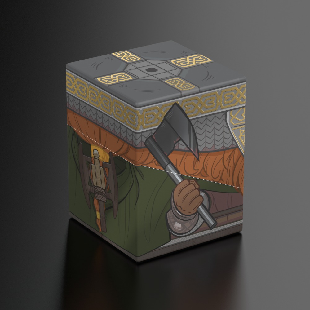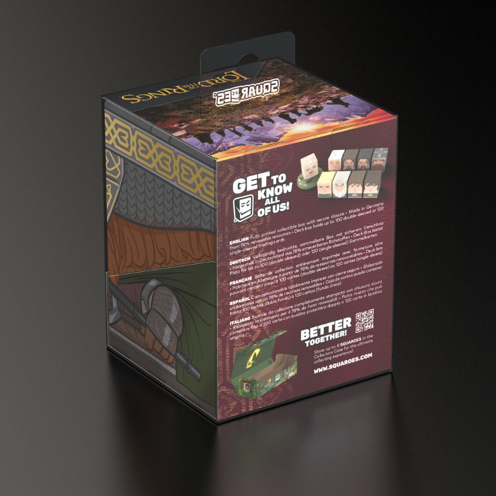 Boîte de collection pour ranger des decks de JCC, des accessoires de jeux de société et/ou des objets de collection. Le modèle Gimli Squaroe, issu de l’édition Le Seigneur des Anneaux, peut contenir jusqu’à 100 cartes en double protection lorsqu’il est utilisé comme boîte à deck. Les Squaroes sont fabriquées à partir de 78 % de ressources renouvelables et s’intègrent parfaitement dans la Collector’s Case vendue séparément.