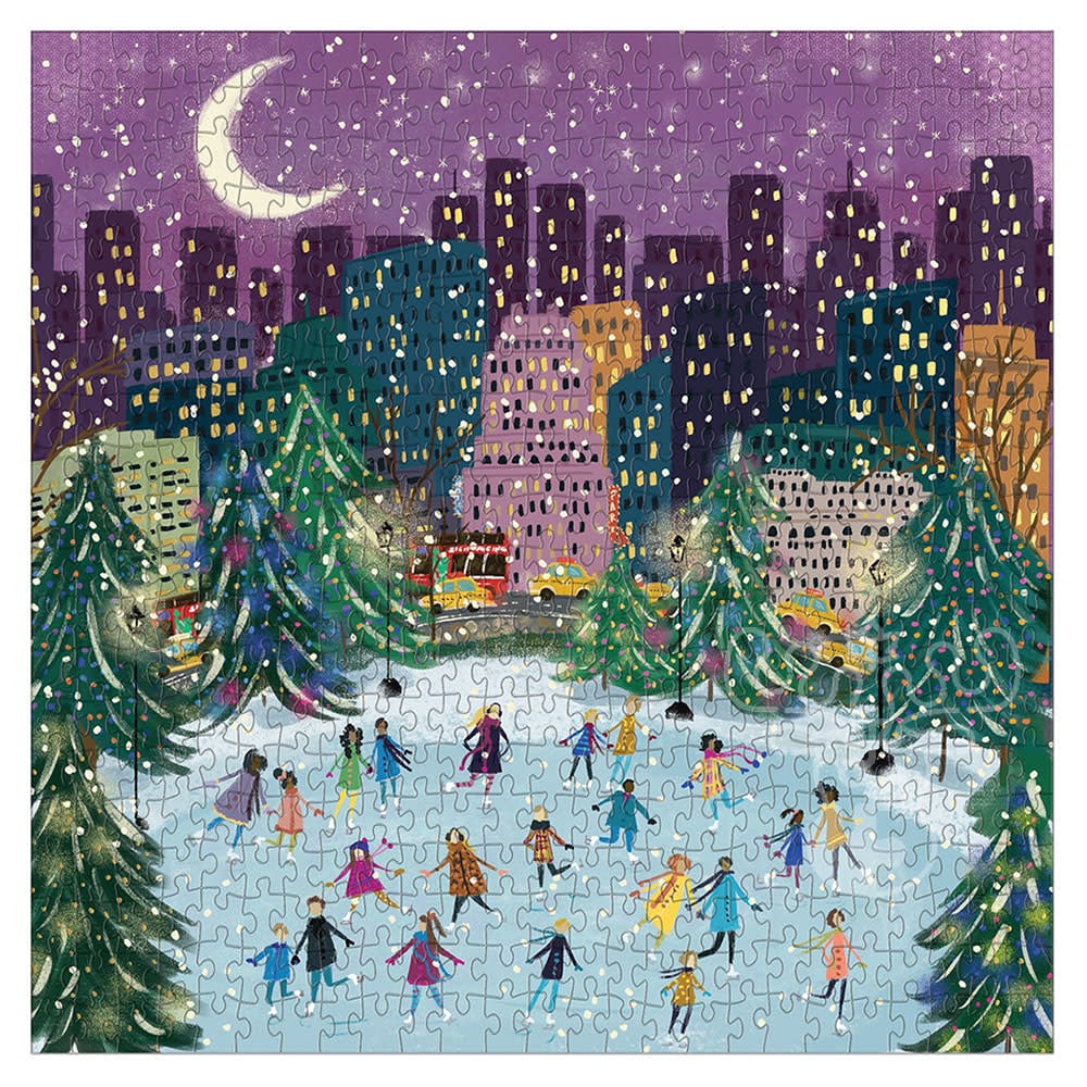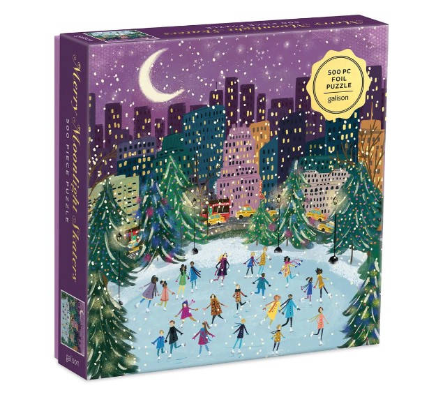 Le puzzle en aluminium de 500 pièces Merry Moonlight Skaters de Galison présente une scène urbaine festive avec des patineurs sur glace, des gratte-ciel et de la neige. Les lumières chatoyantes de la ville prennent vie avec des accents de feuille d'or brillants. Les puzzles Galison sont emballés dans des boîtes robustes au fini mat, parfaites pour offrir, réutiliser et ranger.