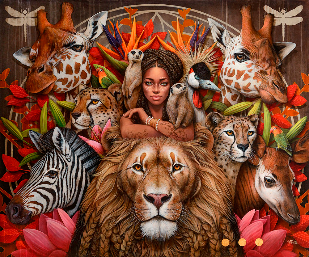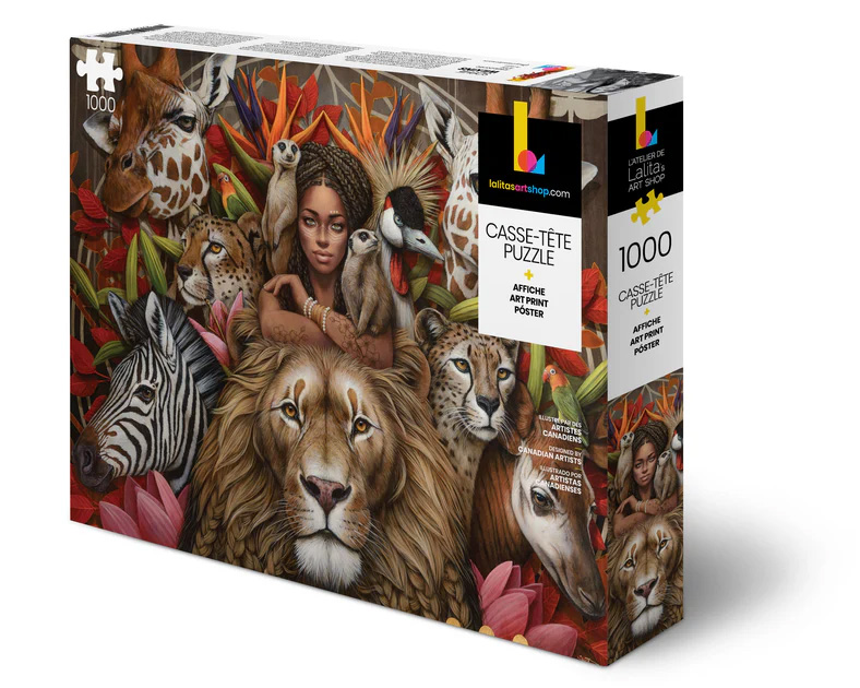 Détendez-vous en assemblant un captivant puzzle d'art de 1000 morceaux inspiré de l'Afrique. Ce casse-tête artistique met en scène une jeune dame entourée d'animaux emblématique de l'afrique, sans oublié le roi de la savane.