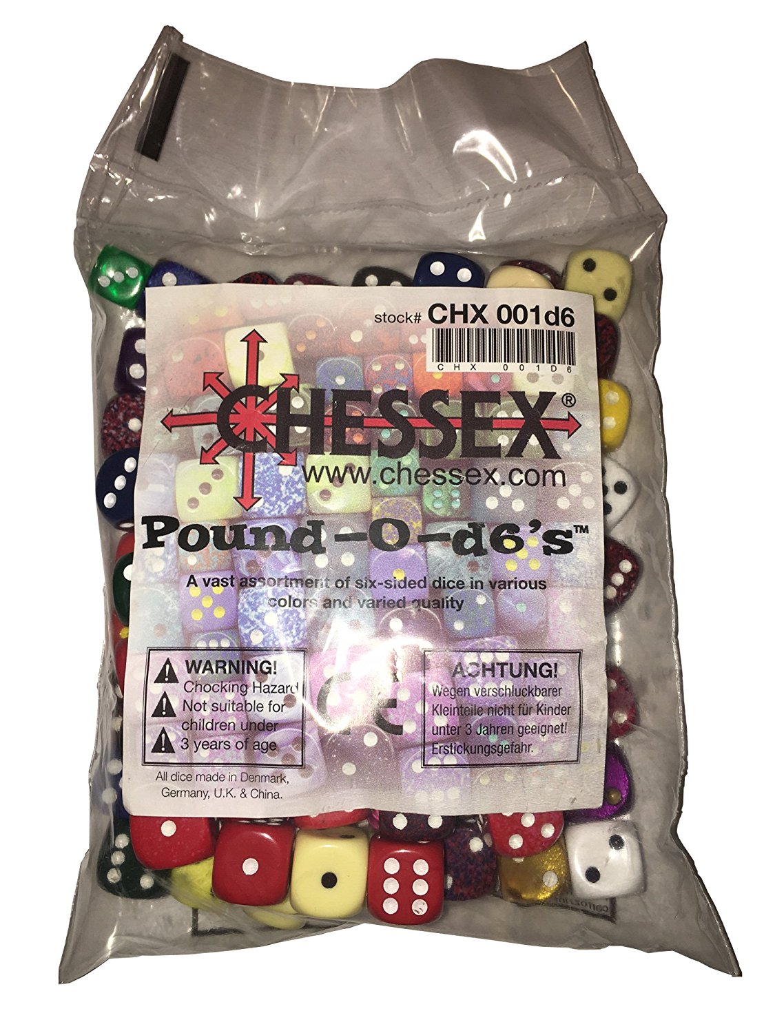 | Un beau gros paquet de dés. Les couleurs sont aléatoires, donc il se peut que vous en trouviez que vous aimez moins. Les dés sont d'une grosseur standard, donc n'allez pas pensé que vous aurez de minis d6. Ce n'est pas le cas. | |