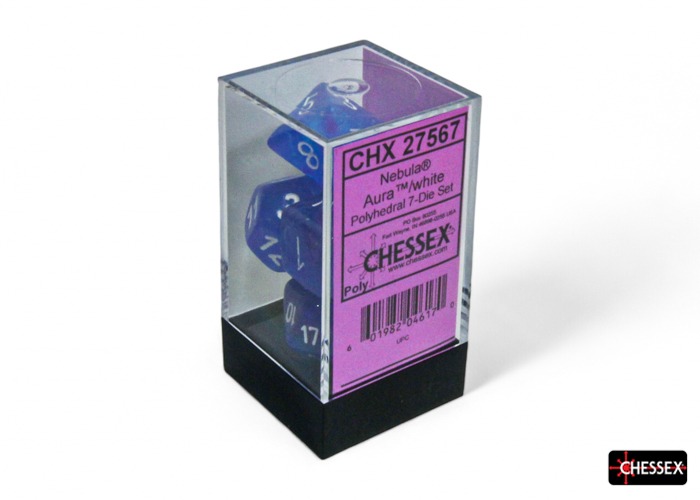 CHESSEX - ENSEMBLE DE 7 DÉS JDR # NEBULA - ENSEMBLE DE 7 DÉS JDR, NEBULA BLEU AURA & BLANC - LUMINEUX