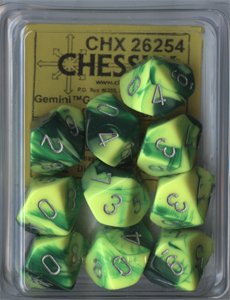 CHESSEX  -  ENSEMBLE DÉS 10D10  # GEMINI  -  ENSEMBLE DÉS 10D10, GEMINI VERT/JAUNE AVEC CHIFFRES ARGENT