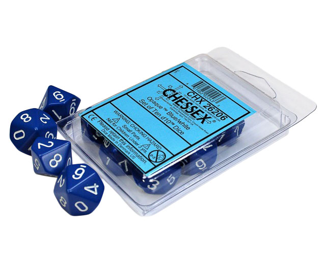 CHESSEX - ENSEMBLE DÉS 10D10, OPAQUE NOIR BLEU/BLANC - ENSEMBLE DÉS 10D10 OPAQUE est catégorisé dans JEUX DE RÔLES / ACCESSOIRES / DÉS en vente chez l'Imaginaire, un magasin-boutique et un site web spécialisé.
