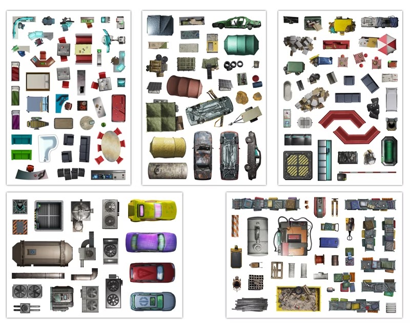 Des éléments de mobilier urbain (bennes à ordures, enseignes néon) aux structures technologiques saisissantes et terrains futuristes, ces autocollants apportent un niveau de détail et d’immersion incomparable à vos cartes.