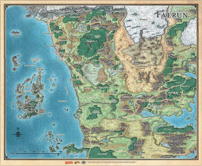Montrant la Sword Coast au complet, cette cartration de l/strong>s diff>Sol?????Ces dés sont colorés au bleu foncé des profondeurs, o