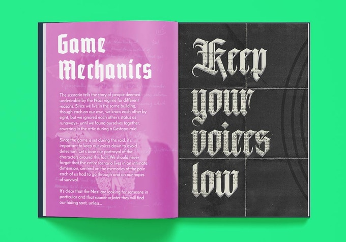 First They Came needs no game master or preparation. It not just a manual, but a richly illustrated, full-color artbook. The entire game is supported and complemented by audio tracks designed to take immersion and identification to a higher level, downloadable from a dedicated link or using a QR code included in the book. The music and ambient sounds are organically incorporated into the different scenes and provide atmospheres, clues, and threats. Guided by audio tracks, players step into the role of those persecuted by the regime for ethnic, political, gender, or religious reasons.